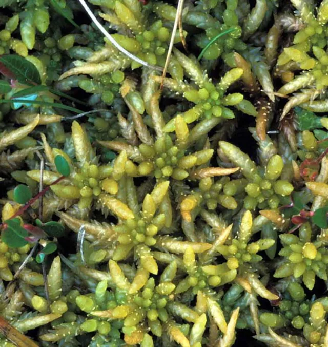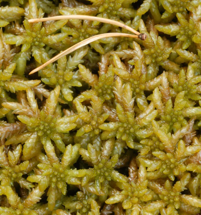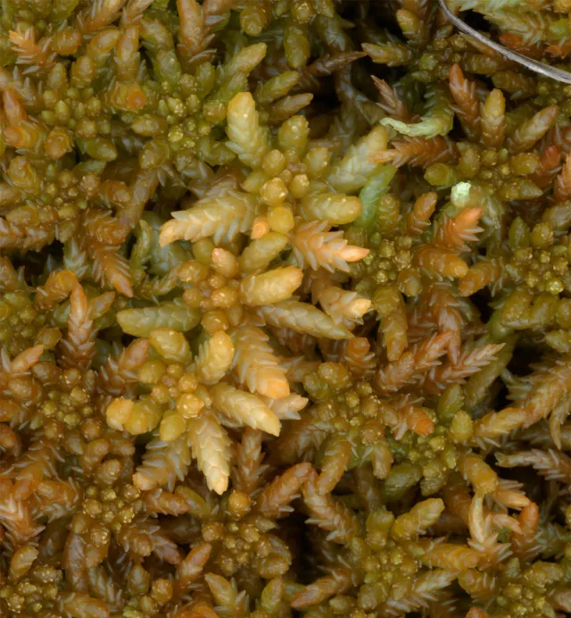 Gulltorvmose i sammenvoksning med en av artene den lett forveksles med; vortetorvmose Sphagnum papillosum (pa).