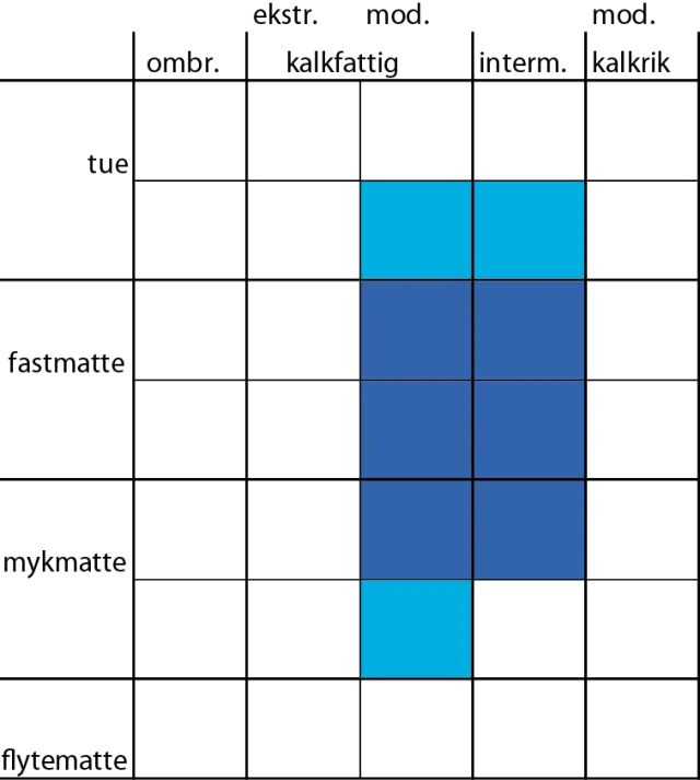 Fastlandet: VåS: Geogen; (myrflate), åpen myrkant, (myrskog). Jordvannsindikator, mangler på nedbørmyr. FaS: (Intermediær kystfukthei). (Intermediært til kalkfattig fuktberg).