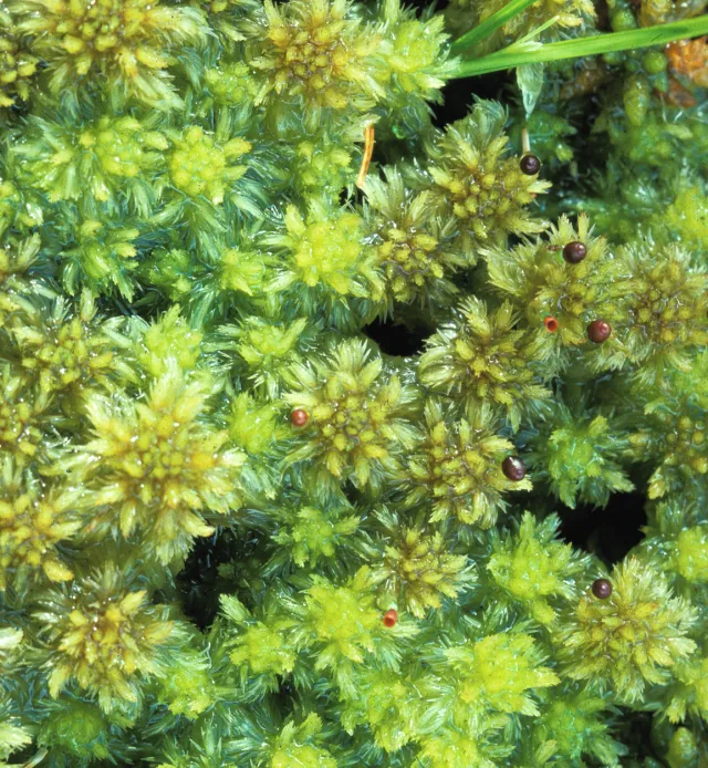 Sammen med vasstorvmose Sphagnum cuspidatum med sporehus og mer brunfarge i hodene.