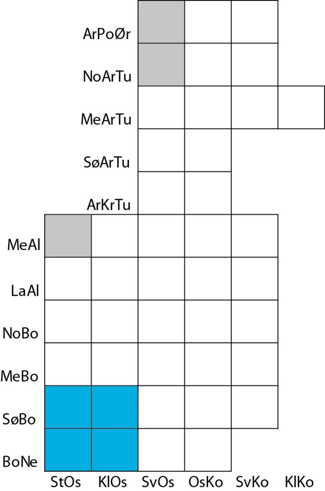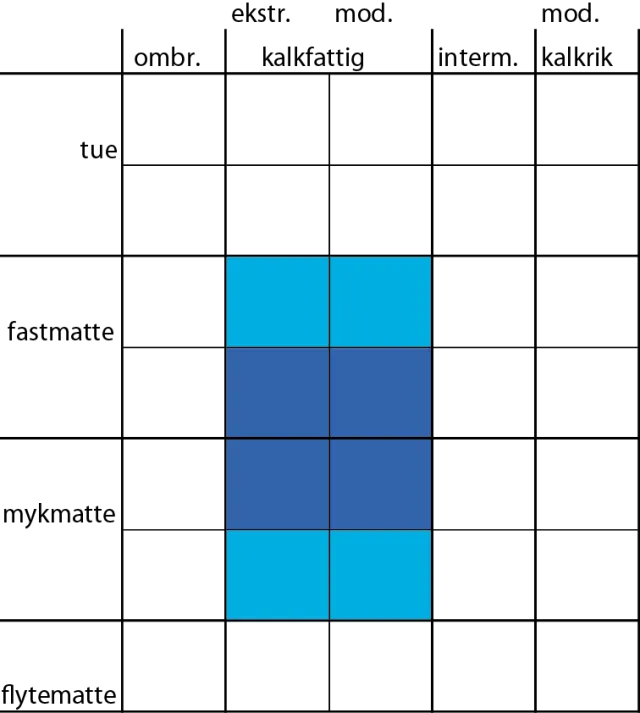 Gruppe: Sterkt til moderat vestlig. Fastlandet: BoNe→SøBo; StOs→KlOs. Spredd langs kysten fra Øf: Fredrikstad, BoNe/KlOs til ST: Frøya, SøBo/StOs, (NT: Snåsa, MeBo/SvOs, usikker).