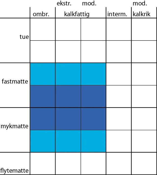 Fastlandet: VåS: Ombrogen; myrflate, (åpen myrkant). Geogen; myrflate, åpen myrkant. Ofte på myr med stagnerende torvdannelse og erosjon. FaS: Kalkfattig kystfukthei. Kalkfattig boreal fukthei. Intermediært og kalkfattig fuktberg.