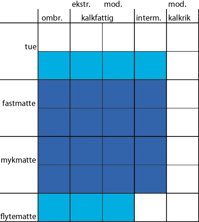 Fastlandet: VåS: Ombrogen; myrflate. Geogen; myrflate, åpen myrkant. Trolig for det meste bundet til jordvannsmyr på Østlandet. FaS: Kalkfattig→intermediær kystfukthei. Kalkfattig og intermediært fuktberg.