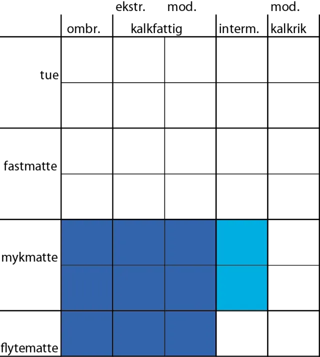 Fastlandet: VåS: Ombrogen; myrflate. Geogen; myrflate, (åpen myrkant, myrskog). Mangler trolig på nedbørmyr mange steder på Østlandet. Intermediær svak grunnkilde og kildemyr. FaS: Kalkfattig frostmark (MeAl fastlandet). Intermediært og kalkfattig fuktberg. Svalbard: VåS: Intermediær permafrost-våtmark.