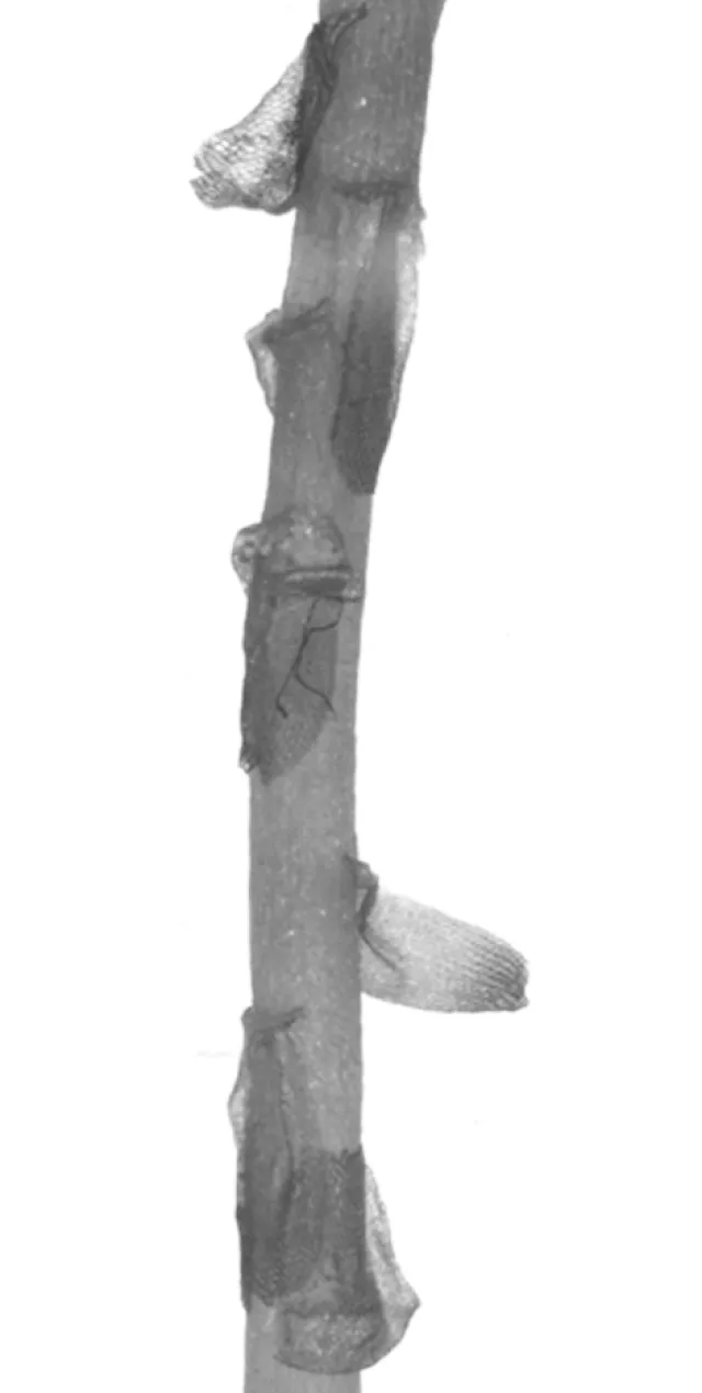Stengelblad til venstre, greinblad til høyre med avkuttet, tannet spiss.Greinblad noe lengre enn stengelblad.