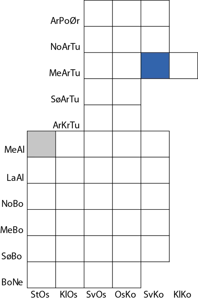 Gruppe: Sterkt nordlig/nordøstlig. Svalbard, Spitsbergen: MeArTu; OsKo. Spredd i fjordstrøkene i Isfjorden og Van Mijenfjorden.