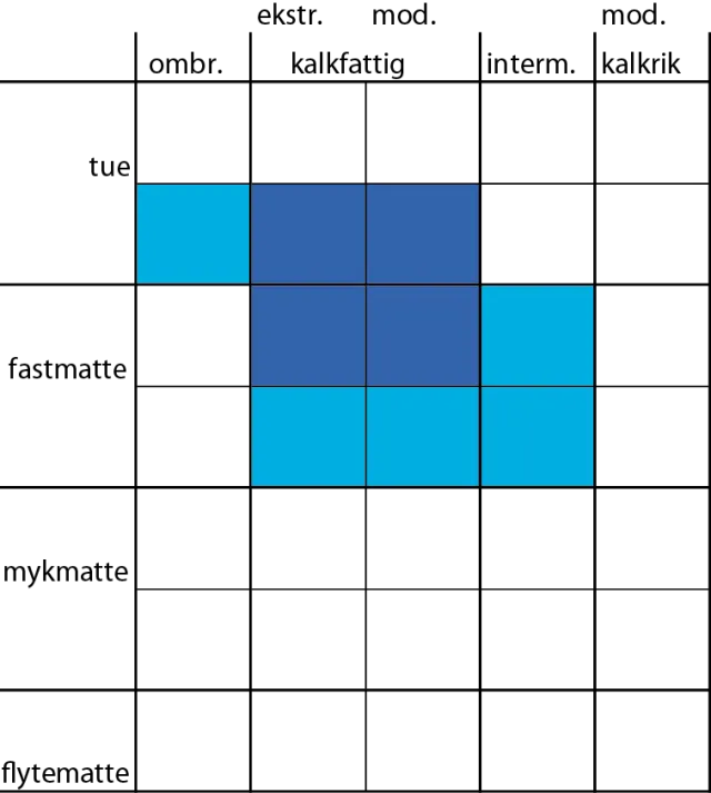 Fastlandet: VåS: (Ombrogen; åpen myrkant, myrskog). Geogen; åpen myrkant, myrskog. (Intermediær svak grunnkilde). Intermediær kildemyr. FaS: Småbregnefuktskog. Blåbærfuktskog. (Lyngfuktskog). (Kalkfattig kystfukthei). Kalkfattig boreal fukthei. Kalkfattig fjellfukthei. Småbregne/ blåbær-lesidefukthei. Snøleie. Kalkfattig frostmark (MeAl). Kalkfattig og intermediært fuktberg, fosseberg. Svalbard: FaS: Kantlyngfukthei. Kalkfattig frostmark. Kalkfattig mosetundra.