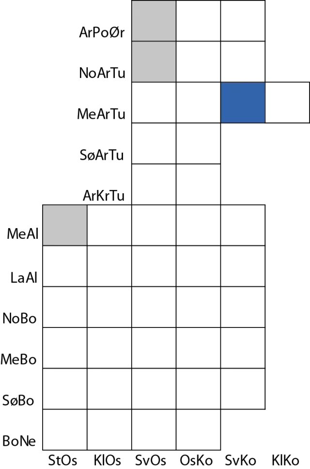 Gruppe: Sterkt nordlig/nordøstlig. Svalbard: MeArTu/SvKo. Spitsbergen, spredd på sørsiden av Isfjorden fra Bolterdalen til Colesbukta, og nordsiden av Bellsund–Van Mijenfjorden.