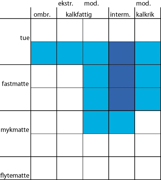 Fastlandet: VåS: (Ombrogen, sj. StOs på Vestlandet). Geogen; myrflate, åpen myrkant, myrskog (Vestlandet). (Intermediær kildemyr). FaS: Intermediær kystfukthei. Intermediært→kalkrikt fuktberg.