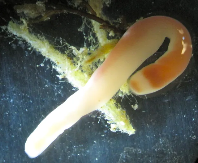 Length up to 8 cm, width up to 2 mm. Dorsal side of body usually bright red and domed, ventral side distinctly paler and somewhat flattened. Head eyeless, somewhat flatter and wider than body, with lateral slits extending backwards to the cross furrow by which the head is demarcated. Upper side of head with a characteristic white patch of varying size and shape (sometimes covering the entire head except the outermost apex). Caudal cirrus small and translucent, often indistinct and frequently lost. Found on shell gravel bottoms, among algae (e.g. Corallina spp.) or cnidarians, sponges (Porifera) etc. on rock, and on sandy clay. First recorded in ERMS region in 2006 (Skagerack).