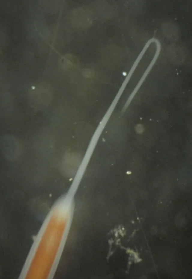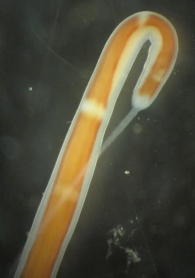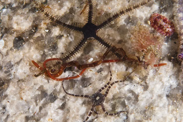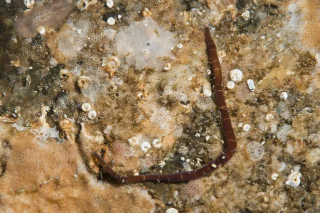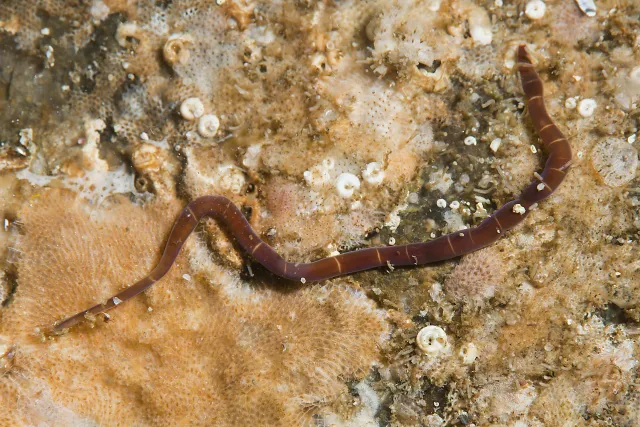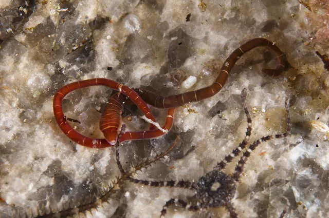 Length up to 15 cm, width up to 3 mm. Body somewhat dorsoventrally flattened, usually dark reddish brown with a paler dorsal side and somewhat irregularly interspersed thin, pale cross-bands. Head paler than body (sometimes entirely white, or at least with pale margins) with a row of up to 12 dark eyes on either side, and distinct lateral slits. Young juveniles are paler, eyeless and often lacking pale cross-bands. Typically found on shell gravel bottoms and among algae etc. on rock and stones from the shoreline down to a depth of 140 m or more, often in association with oysters. Occasionally found also on soft bottoms. Preys mainly on bristleworms of the family Polynoidae, but also known to catch closely related nemerteans.