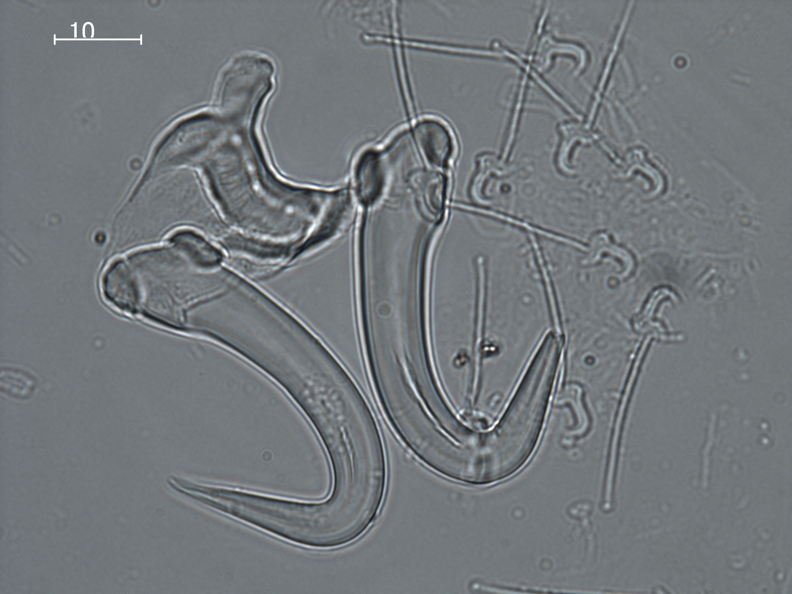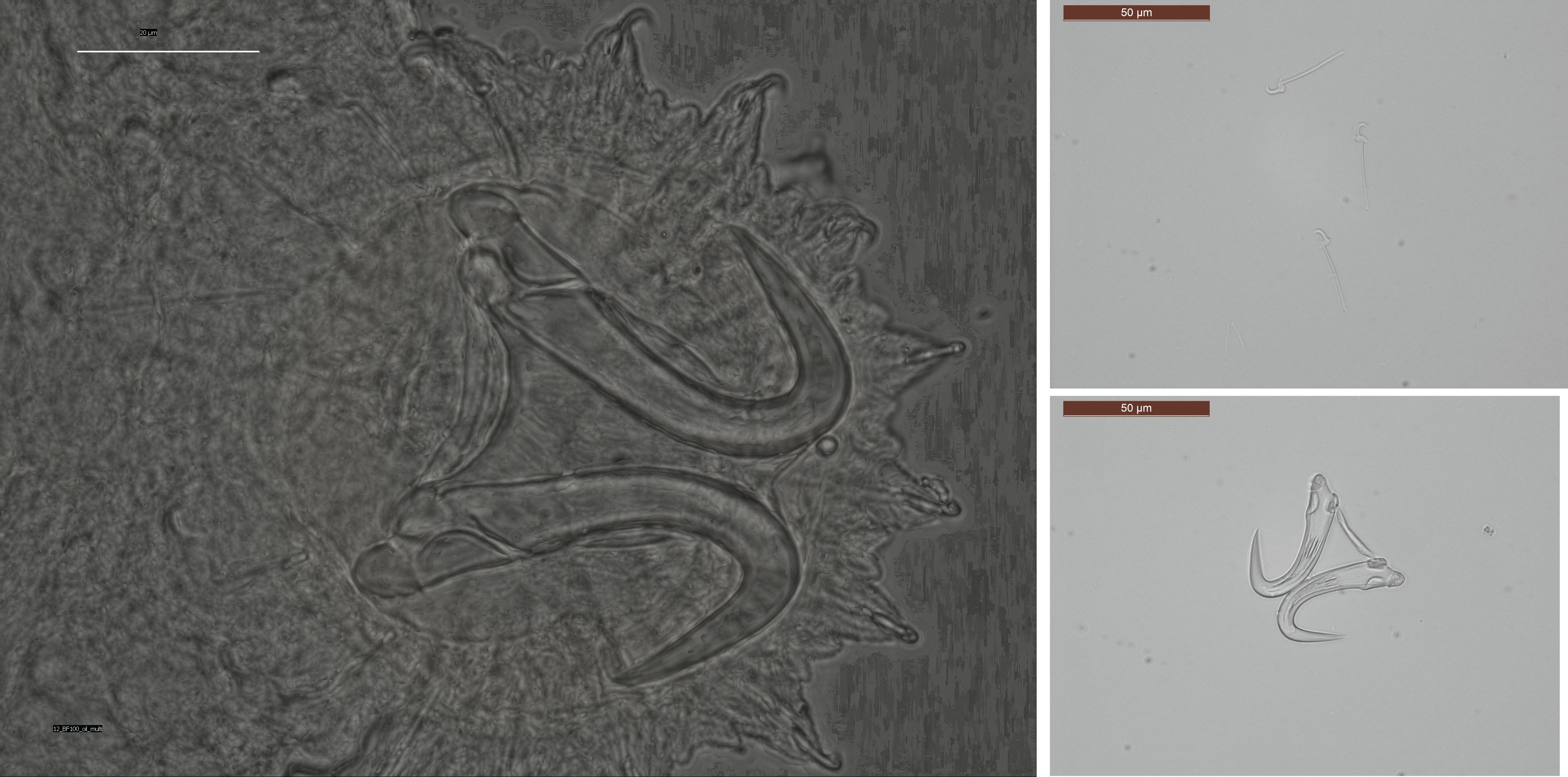 Kroker på hefteorganet - opisthaptor - blir brukt av Gyrodactylus parasitter for å feste seg til verten, og er viktige strukturer for morfologisk artsbestemming. Bildet er av krokene til en Gyrodactylus pterygialis funnet på sei Pollachius virens.