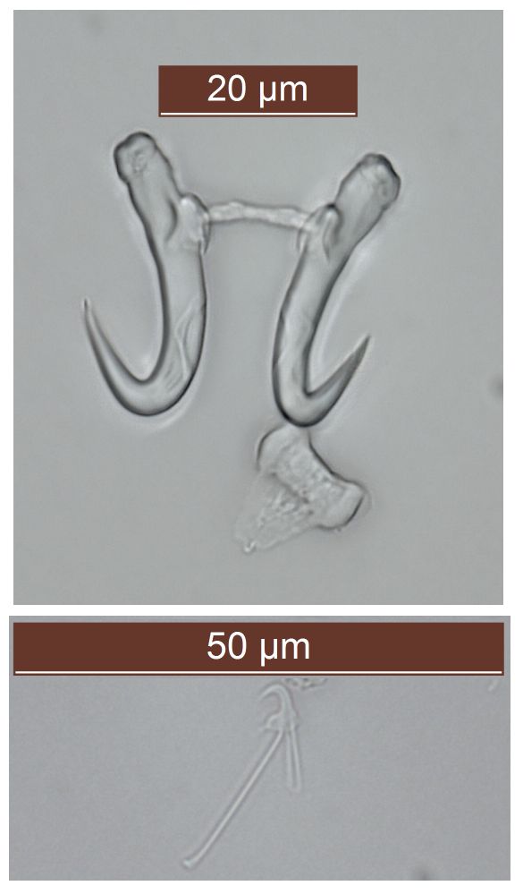 Kroker på hefteorganet - opisthaptor - blir brukt av Gyrodactylus parasitter for å feste seg til verten, og er viktige strukturer for morfologisk artsbestemming. Bildet er av krokene til en Gyrodactylus pterygialis funnet på sei Pollachius virens.