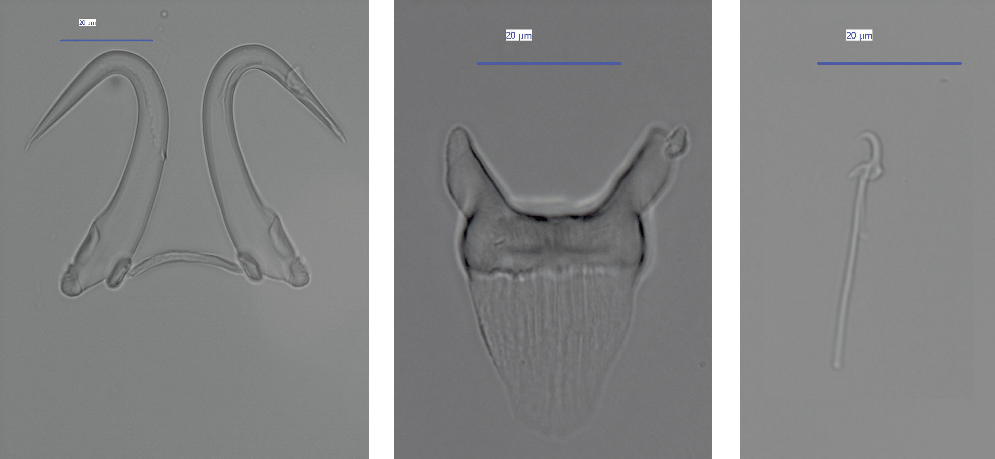 Kroker på hefteorganet - opisthaptor - blir brukt av Gyrodactylus parasitter for å feste seg til verten, og er viktige strukturer for morfologisk artsbestemming. Bildet er av krokene til en Gyrodactylus pterygialis funnet på sei Pollachius virens.