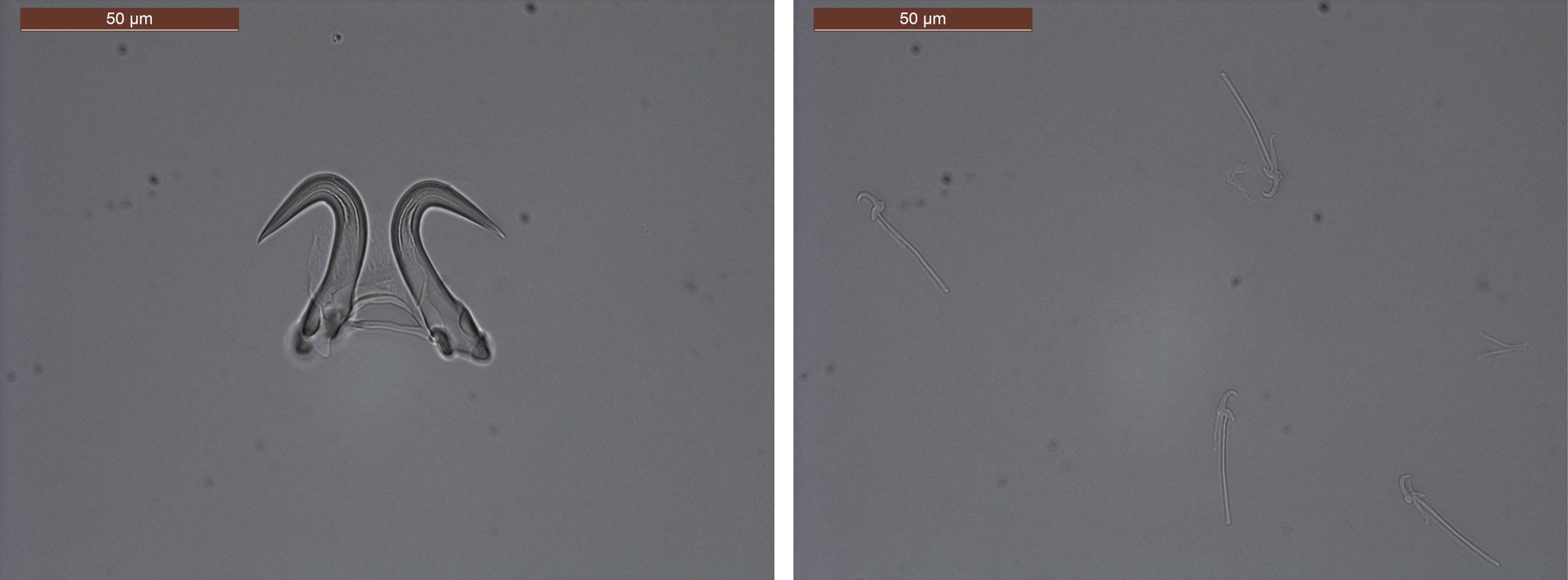 Kroker på hefteorganet - opisthaptor - blir brukt av Gyrodactylus parasitter for å feste seg til verten, og er viktige strukturer for morfologisk artsbestemming. Bildet er av krokene til en Gyrodactylus pterygialis funnet på sei Pollachius virens.