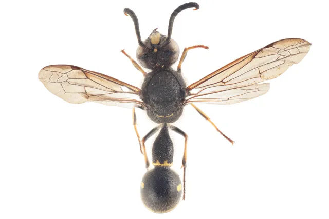 Hos hunnen er hodet svart med en gul flekk i panna mellom antennefestene og en gul strek bak hvert fasettøye. Hannen har i tillegg en stor gul flekk på munnskjoldet. Munnskjoldet er tydelig innbuktet i framkanten hos begge kjønn. Antennene er helsvarte hos hunnen. Hos hannen er antennene lysere mot spissen og det siste leddet er vendt bakover som en krok. Mellomkroppen hos begge kjønn er påfallende kulerund i formen og ca. så lang som bred. Fargen på mellomkroppen er noen ganger helsvart, særlig hos hannene, men oftest finnes gule tegninger i varierende utstrekning på frambrystets overside, vingeskjellene, skutellum og bakryggen. Første bakkroppsledd er smalt klokkeformet og mye smalere enn andre ledd og fremstår dermed avsnørt fra resten av bakkroppen. Bakkroppen hos begge kjønn har lyse bånd langs bakkanten på de to første ryggleddene. Det gule båndet på førsteleddet er oftest kraftig utvidet på hver side av midten. Båndet på andre ryggledd er litt smalere på midten og smaler jevnt av ut mot sidene. Dette leddet har også en avlang midtflekk på hver side. Bakkroppens to første ledd har lang og utstående behåring både på over- og undersiden. Beina hos begge kjønn er svarte, men med utbredte lyse partier på knær og legger.