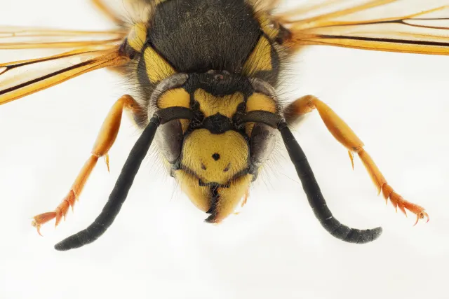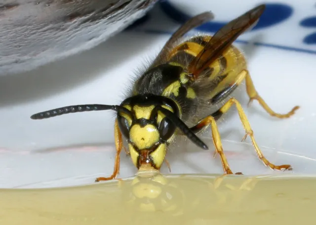 Arbeider av tyskveps Vespula germanica som drikker sukkervann. Trondheim i Trøndelag.