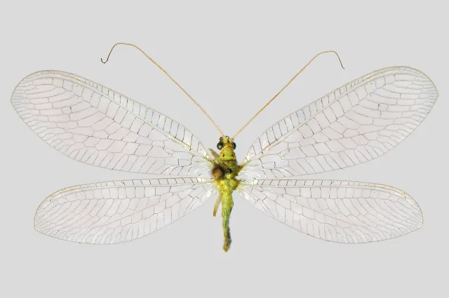 Hodet er grønt med fem svarte flekker, to foran hvert øye, som i sjeldne tilfeller kan være smeltet sammen til én, og én mellom antennene. Maxillepalpene med svarte ringer. Ingen markeringer bakenfor antennene, som er brungule innerst og litt mørkere ytterst; på baksiden av innerste ledd (scapus) er det ofte en rund, svakt brunaktig flekk. Forkroppen er grønn med noen små, parvise mørke flekker. På alle fire vinger finnes en liten svart flekk innerst på costa. Lengderibbene er grønne, og de fleste tverribber er delvis eller helt svarte. De med helt svarte tverribber i costalfeltet har sørover i Europa vært regnet som P. abdominalis (Brauer, 1856), men det er vist at begge arter kan ha begge varianter. Norske dyr må undersøkes bedre, da i hvert fall noen herfra ser ut til å passe bedre med abdominalis enn prasinus. Den innerste tverribben i costalfeltet, like utenfor den mørke flekken, ofte kraftigere farget enn de øvrige. Bakkroppen er ensfarget grønn, også på undersiden. Beina er grønne, og føttenes klør har en utvidelse ved basis. Forvingelengde 10–18 mm.