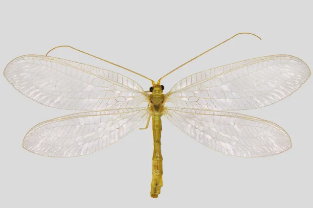 Både hode, forkropp og bakkropp er ensfarget lysegrønne eller blekgrønne med en lys midtlinje, og helt uten mørke flekker eller tegninger. Kun på noen av leddene i maxillepalpene er det mørke streker. Antennene er gulgrønne, og det innerste leddet (scapus) er ca. dobbelt så langt som bredt, og lenger enn øyets diameter, mer utpreget hos hannen enn hos hunnen. Vingene er lange og smale, og forvingens forkant er rett eller svakt konveks. En del av de innerste tverribbene i costalfeltet er svarte/mørke, men blir lysere mot endene. De fleste andre ribber er grønne. Forvingelengde 17–25 mm.
