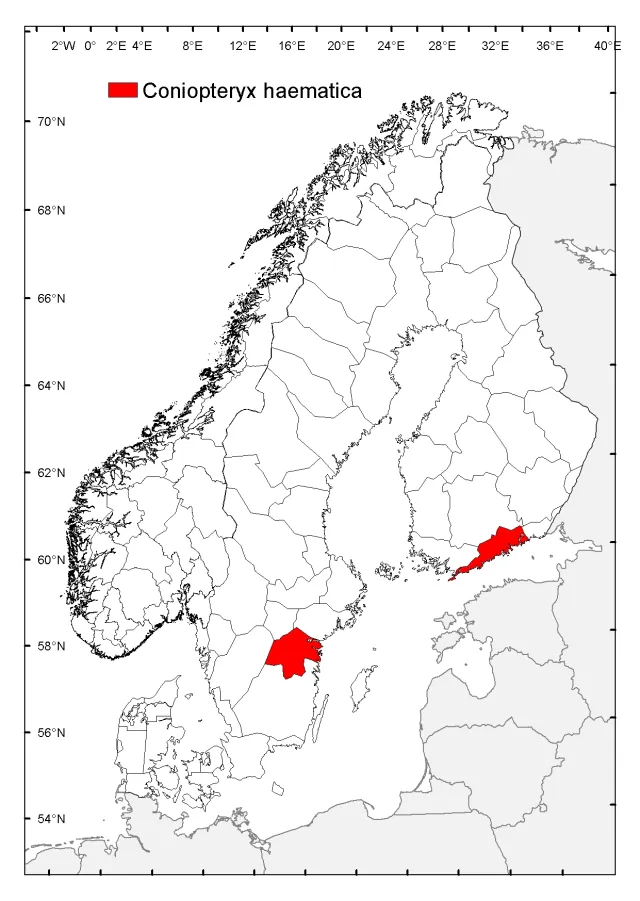 Coniopteryx haematica er i Norden bare kjent fra noen få lokaliteter Sverige og Finland.