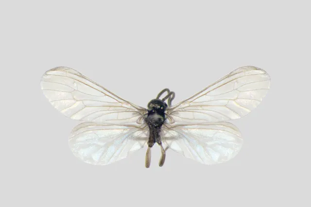 Hodet er mørkebrunt og sterkt glinsende, og antennene er mørkebrune med 26–34 ledd. Vingene er gråbrune med mørkebrune ribber, hvis en fjerner vokslaget. Både i for- og bakvingen er tverribben mellom Cu1 og M plassert nærmere vingebasis enn Ms forgreningspunkt. Hele dyret er normalt dekket av en hvit voks som levende, og fremstår derfor som ensfarget hvitt. Forvingelengde 2,2–2,7 mm.