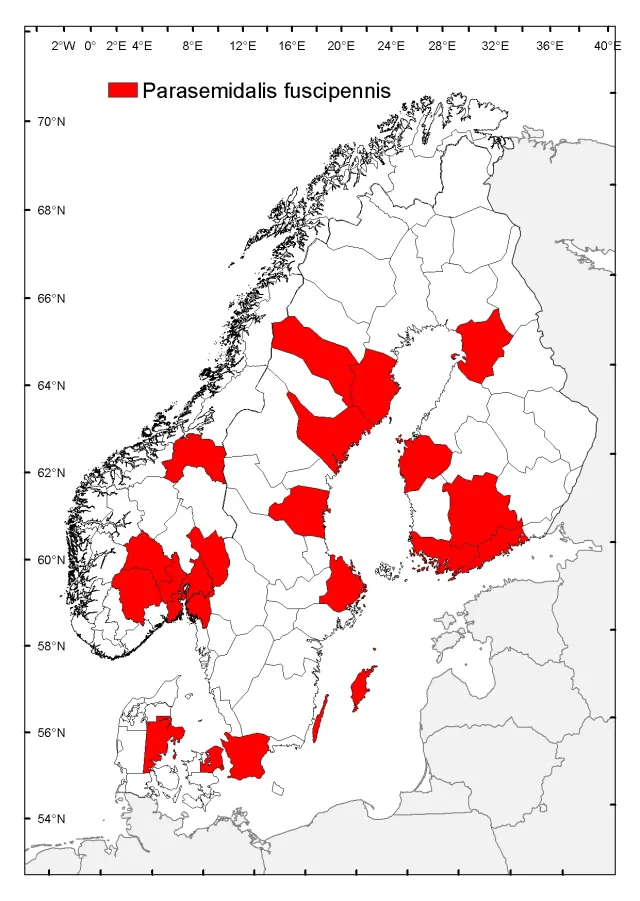 Parasemidalis fuscipennis er vidt utbredt, men har små bestander.