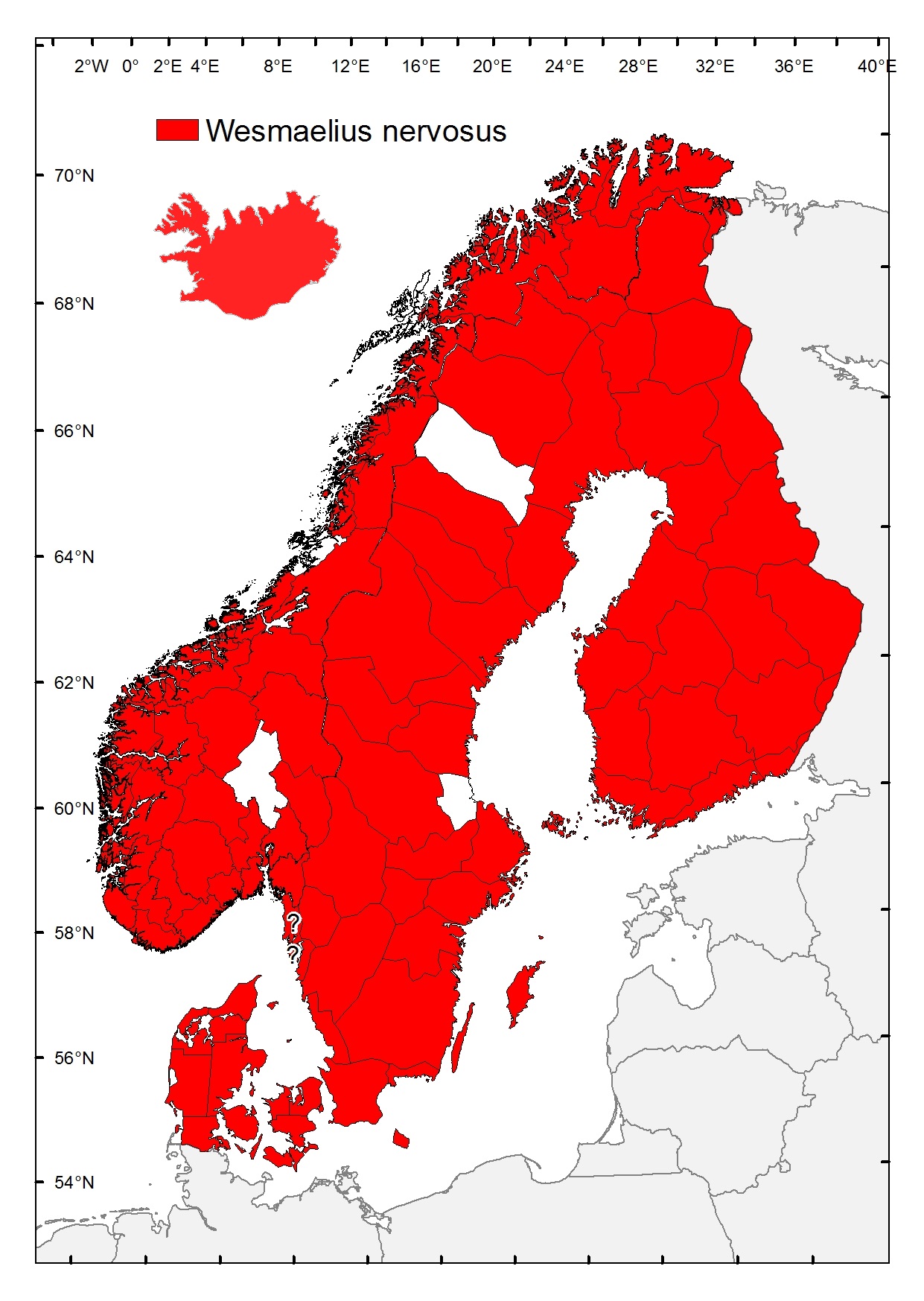 W. nervosus er funnet i alle fylker i Norge og i så godt som alle deler av Sverige, Finland og Danmark. Den finnes dessuten i Island og på Grønland og Færøyene. Ellers finnes arten i store deler av Mellom- og Nord-Europa, og utbredelsen fortsetter mot øst gjennom Asia til Sibir.