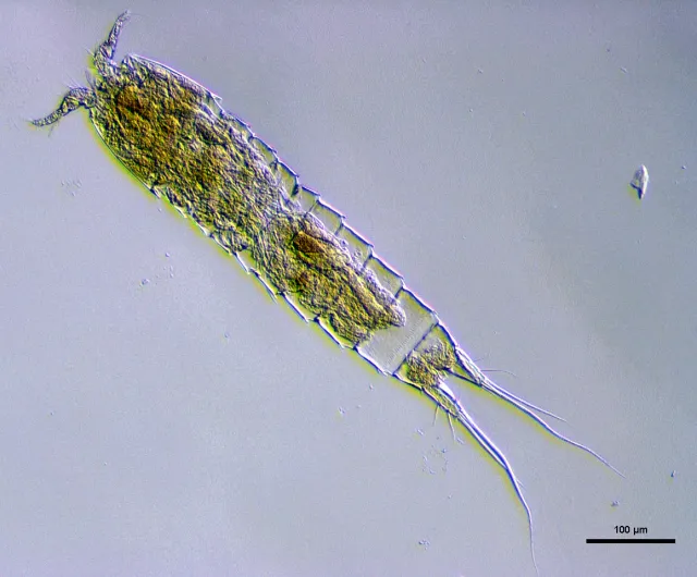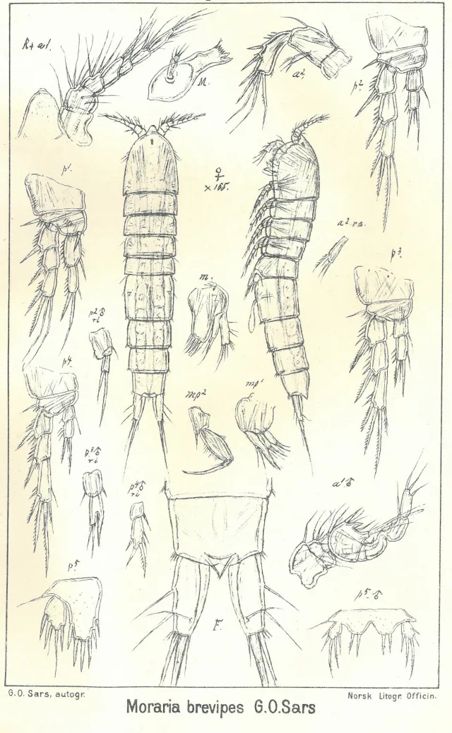 Moraria brevipes har en slank, sylindrisk kropp med relativt korte bein. Ytre del (exopod) av de fire første benparene har tre ledd, mens tilsvarende indre benpar (endopod) er 2-leddet. Hos første benparet er indre del noe kortere enn ytre del. Hos de tre neste benparene er ytre del betydelig kortere. Det femte benparet er besatt med små butte og korte pigger. Den framskutte delen av hodepartiet (rostrum) er stort og bredt. Også kjønnsåpningslappen (operculum) er stor, tilspisset og glatt med et trekantet utseende (hos copepoditter har kjønnsåpningslappen en kant som er tannet). Det bakerste leddet på bakkroppen (caudal ramus) er relativt stort og omtrent dobbelt så langt som bredt uten beskyttelse (armorering) på innsiden. Den første antennen (antennule) er kort og består av sju ledd.