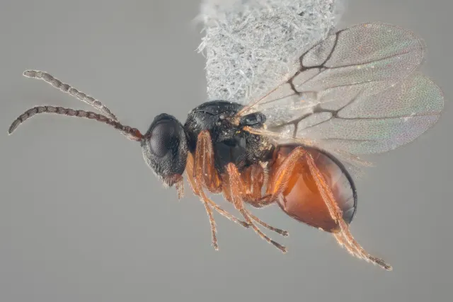 Hann: Ligner hunnen, men har 14 antenneledd. Tredje antenneledd (F1) er noe bøyd midt på og tykkere i spissen. Lengde 1,5–2,0 mm.