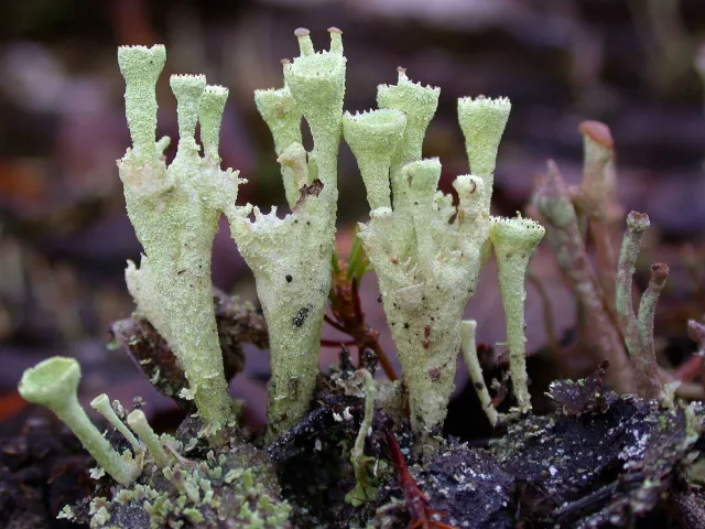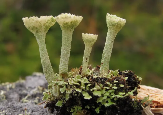 Podetiene er opp til 5 cm høye, med relativt breie begre som kan danne nye begre fra kanten av det gamle. Fargen er overveiende bleikgrønn til gulhvit. Overflata av podetiene er finsorediøs, men etter hvert kan sorediene forsvinne flekkvis og danner hvite, nesten gjennomskinnelige felt. Sjelden forekommer små skjell nær basis av podetiene. Basalskjellene kan være vedvarende, men forsvinner ofte tidlig.