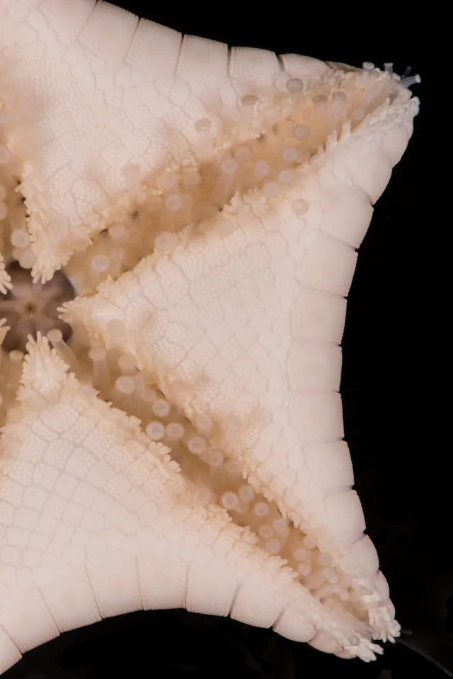 Arten er rødorange på oversiden, og gulhvit på undersiden. Den har ikke så lange armer som mange andre arter har, men ser mer ut som en femkantet plate, eller ”kjeks”. De konvekse, små platene som dekker hele oversiden er dekket med 35-45 korn per plate. De markante marginalplatene har også korn, men med noen nakne områder. Marginalplatene som sitter nærmest midten er ofte bredere enn de er lange, mens det motsatte er tilfelle for platene som sitter lengst ute i armen. På undersiden, i furen med sugeføttene, sitter det 2-4 furepigger per plate. Det er 6-7 munnpigger. Gripetengene, hvis tilstede, ser ut som avlange korn. Arten blir ca. 8 cm i diameter.
