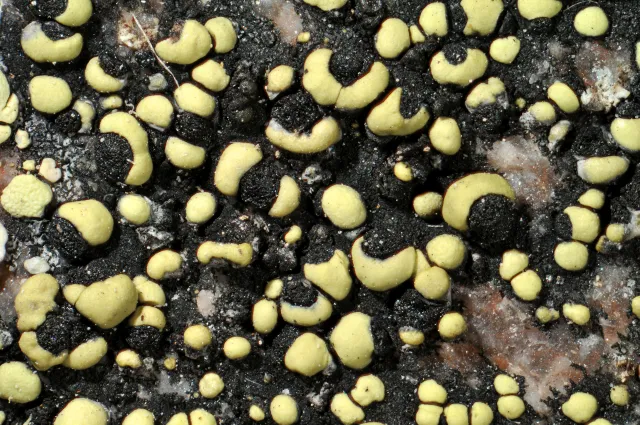 Arten inneholder rhizocarpsyre og psoromsyre. Fargereaksjoner: Margen blir gul når PD tilføres og reagerer ikke når K eller C tilføres (marg PD+ gul, K–, C–).