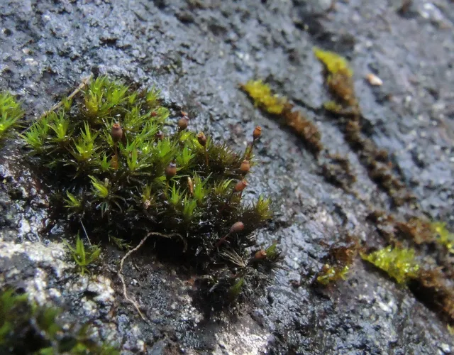 Tue av kulegråmose med sporofytter på periodevis fuktige berg.