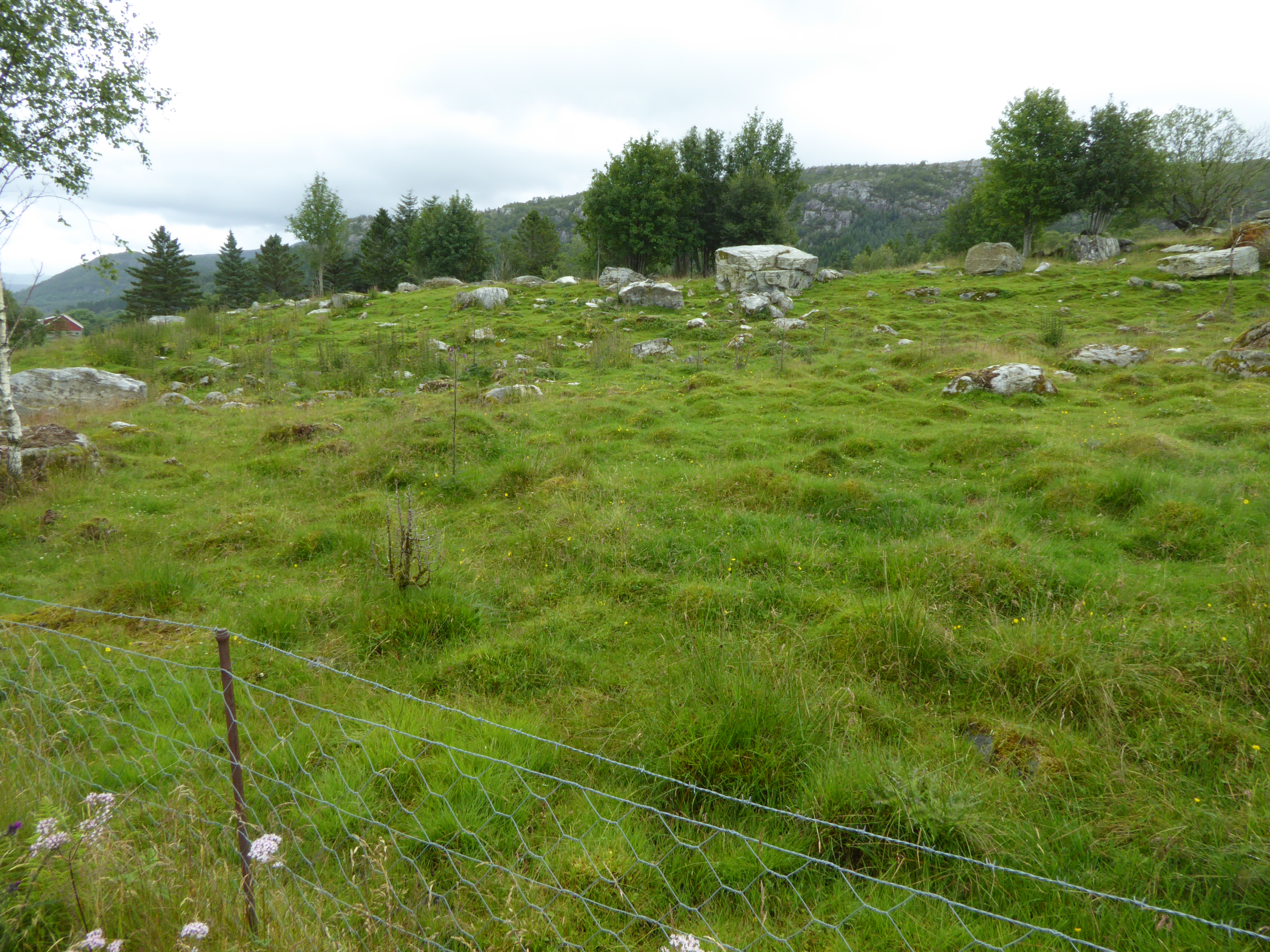 beitemark [oppdyrket varig eng (T45) med litt intensivt hevdpreg (HI∙VI)] dominert av gulaks Anthoxanthum odoratum som er i bruk som sauebeite med lavt beitetrykk (Ho: Fedje). Bruksintensiteten er høy nok til å forhindre gjengroing med busker og trær (7JB–BA∙4), men dersom ikke gjødslingen gjenopptas, vil enga gradvis få et semi-naturlig preg.
