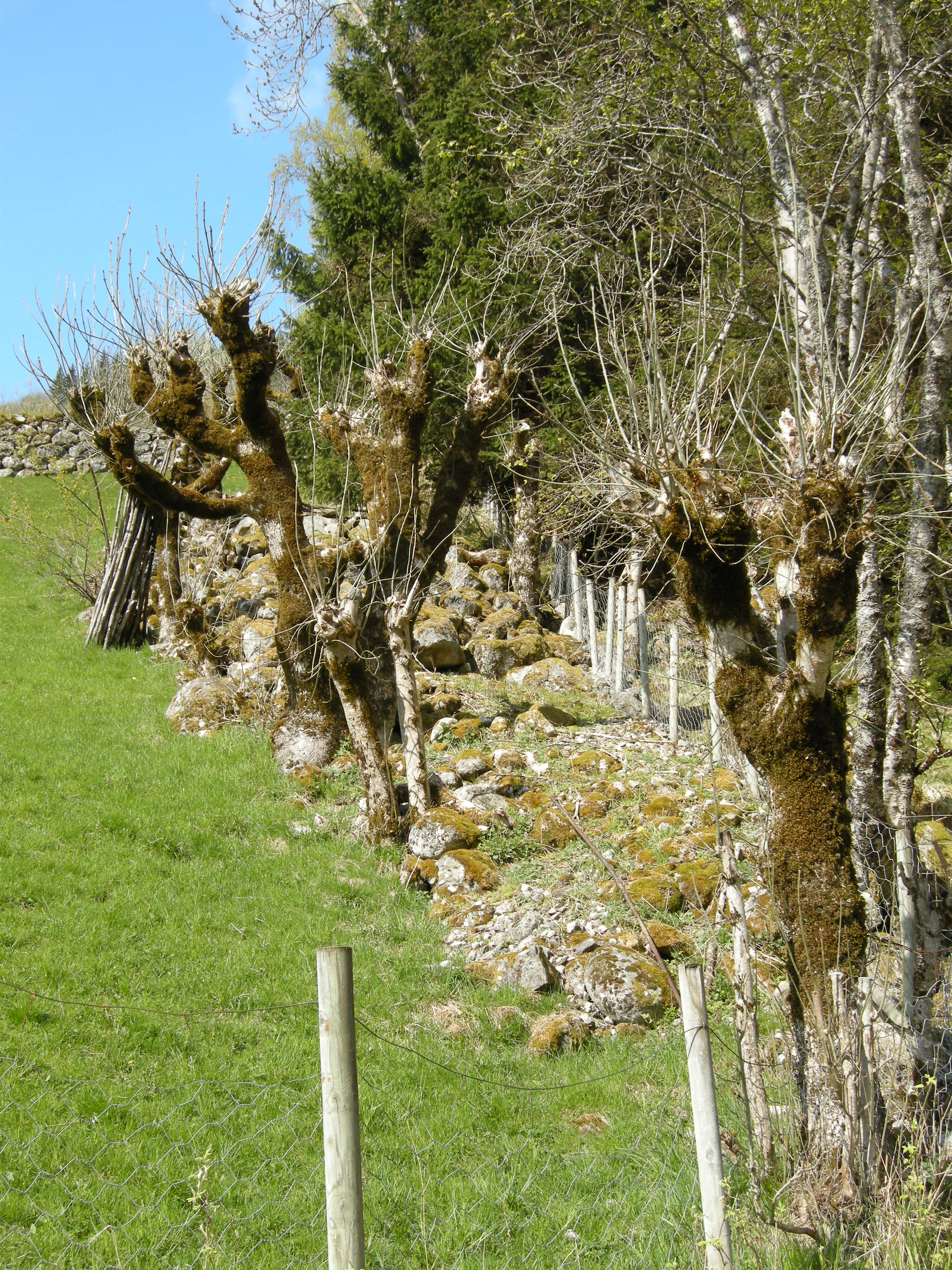 Styvingstrær av ask på Grinde i Leikanger (SF). Bilde viser rekke av skjøttete styvingstrær langs steingard (5KU–AR–SG).