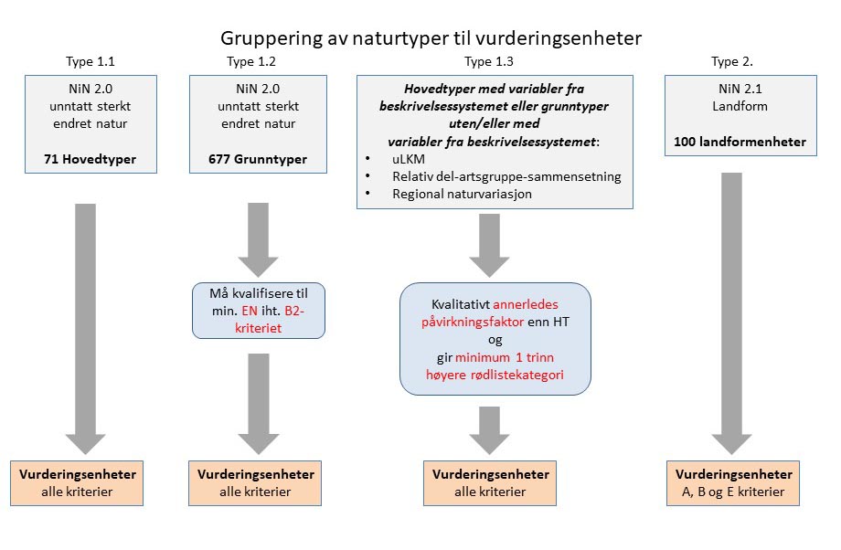Natur i Norge (NiN) legges til grunn når vi skal revidere Rødlista. Men metoden åpner også for at det fastsettes andre typer enn rene hovedtyper eller grunntyper etter NiN. De typene som vurderes kalles derfor vurderingsenheter. Enhetene som skal vurderes ved hjelp av rødlistekriteriene blir definert på grunnlag av bestemte prinsipper. All natur i Norge, men unntak av sterkt endra natur, blir inkludert i arbeidet med å velge ut vurderingsenheter.