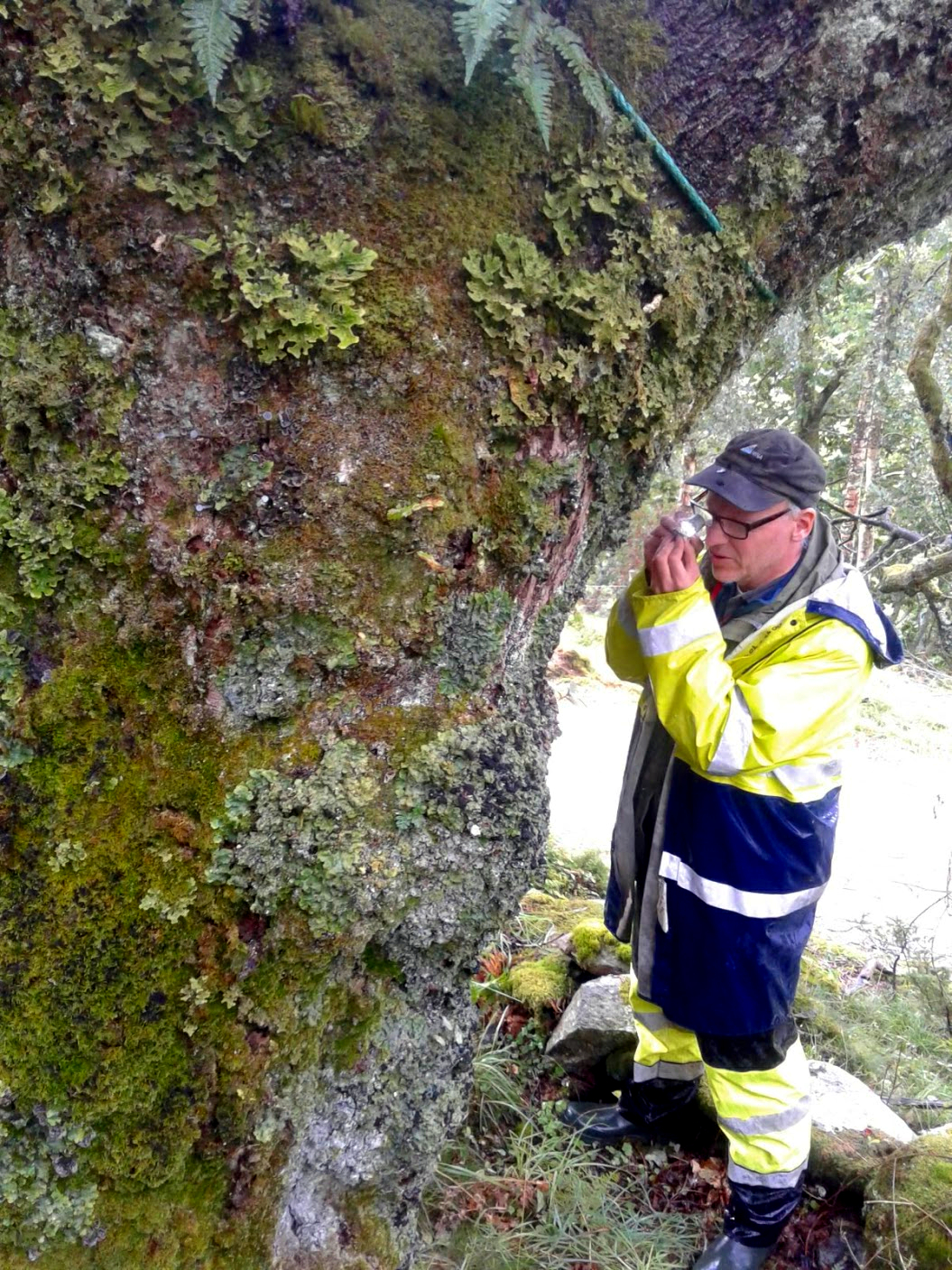 Björn Nordén leter etter sopper på et stort eiketre.