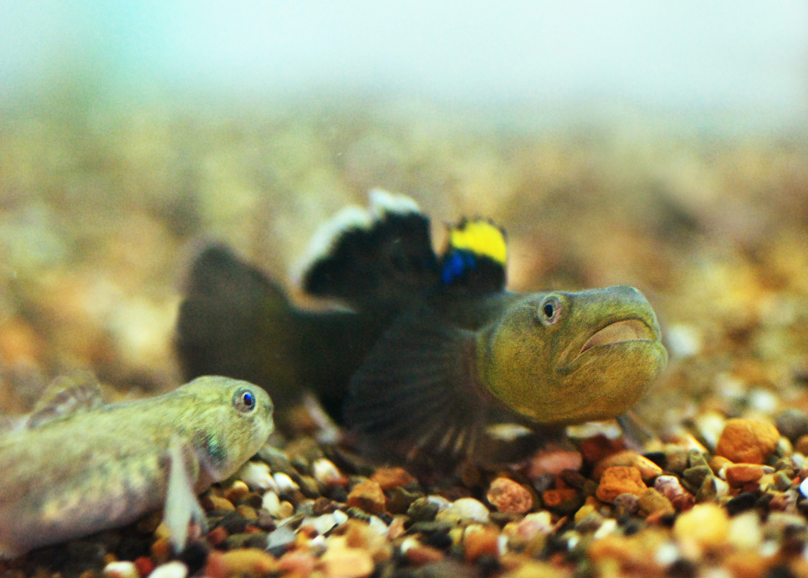 "Desert goby". Her ser vi en hann som kurtiserer en hunn i et akvarium.