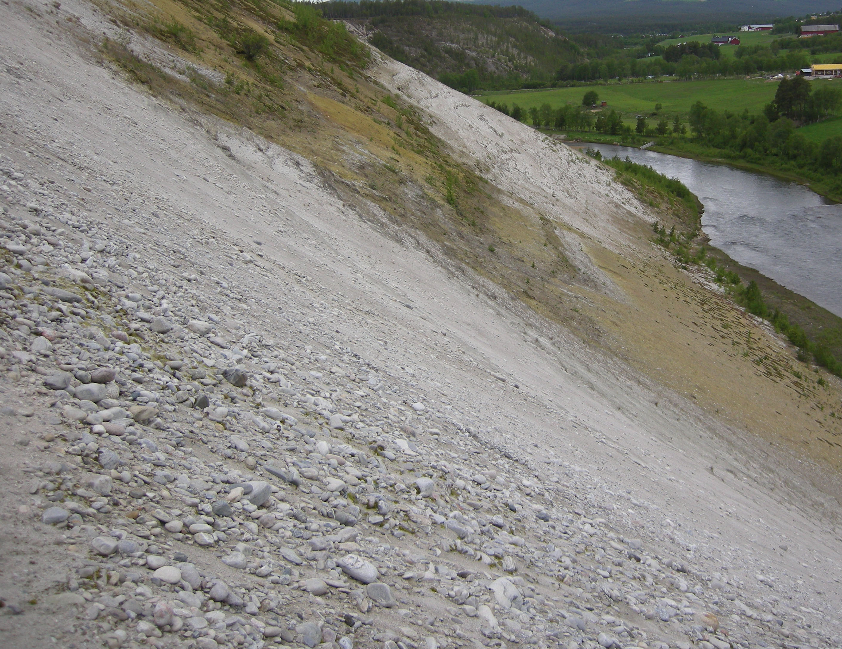 Forekommer i bratte skråninger. Grus- og sandskred skilles i flybilder fra omkringliggende vegetasjon etter farge og terrengform.