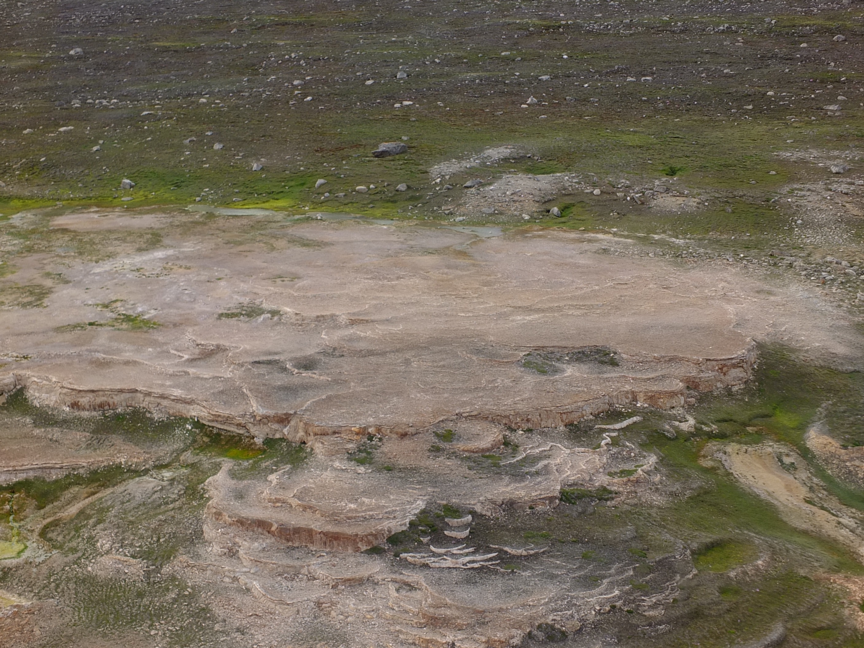 Ligger i hellende terreng. Terrasser med kalktuff og grønn mosedominert vegetasjon skiller mot omgivende tundravegetasjon.