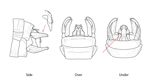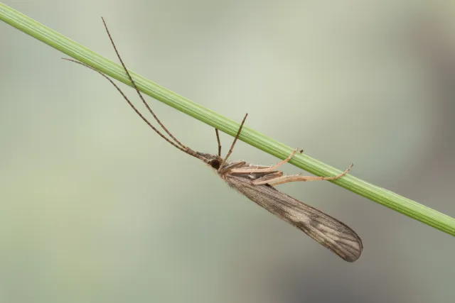 Merk den mørke flekken på maxillepalpens første ledd. Denne mangler hos hannen av Molanna albicans.