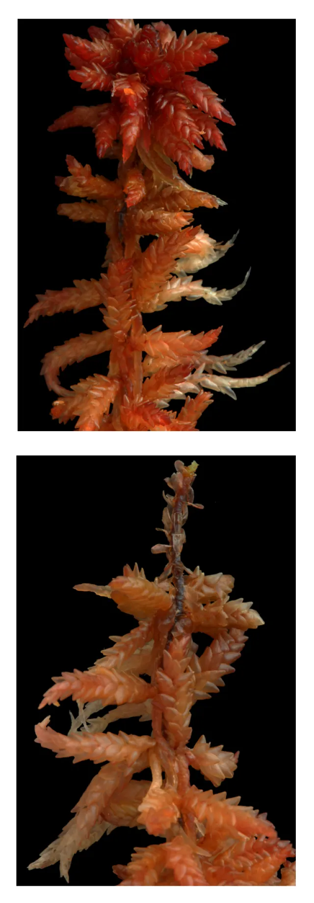 Skudd mellomstore til store, i matter og puter/tuer av varierende størrelse. Hoder purpurrøde til kjøttrøde, nesten flate, utydelig 5-delte. Toppknopp synlig, omgitt av snarlike innergreiner. Mellom- og yttergreiner ± rette, grovt sylindriske, yttergreiner butt tilspissede, blad tydelig utsperrede. Greinknipper tett sammenstilte, med oftest 2 utstående og 2 – 3 spede, bleke, stengeltilliggende hengegreiner. Utstående greiner uryddig sylindriske med oftest butt tilspissede ender. Greinblad ofte uregelmessig rekkestilte, smalt eggformede, løst taklagte og tydelig utsperrede (oftest >  45˚). Stengel mørkt rødbrun til purpurbrun. Stengelblad oftest smalt rektangulære, varierende orienterte langs stengelen, bladspiss bredt avrundet og småfrynset. N = 19. Dioik. Sporehus uvanlig. Sporemasse gulbrun.