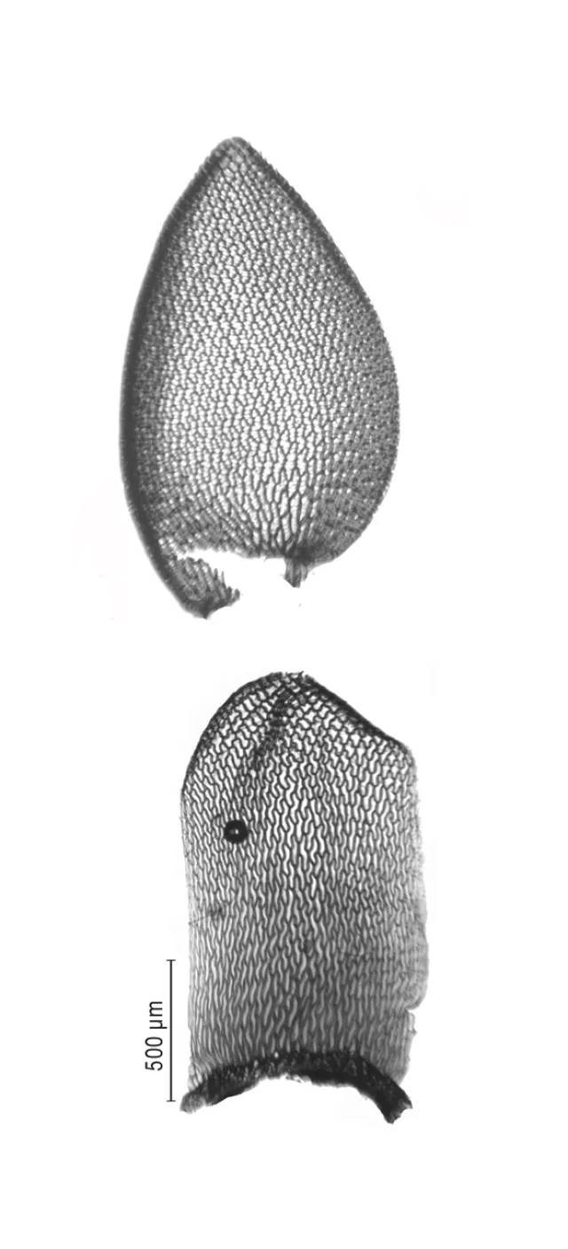 Smalt eggformet greinblad (til venstre) og smalt rektangulært stengelblad (til høyre).