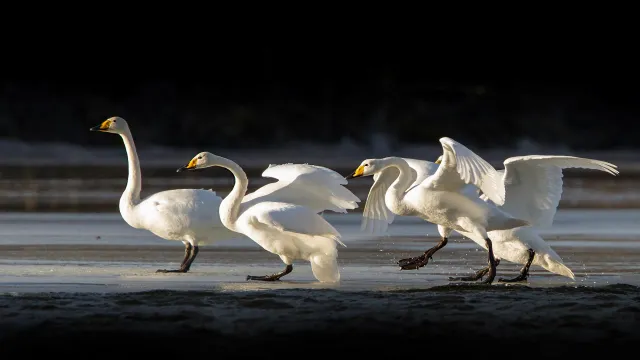 Når sangsvanene står på land, ser man tydelig de store, svarte føttene.
