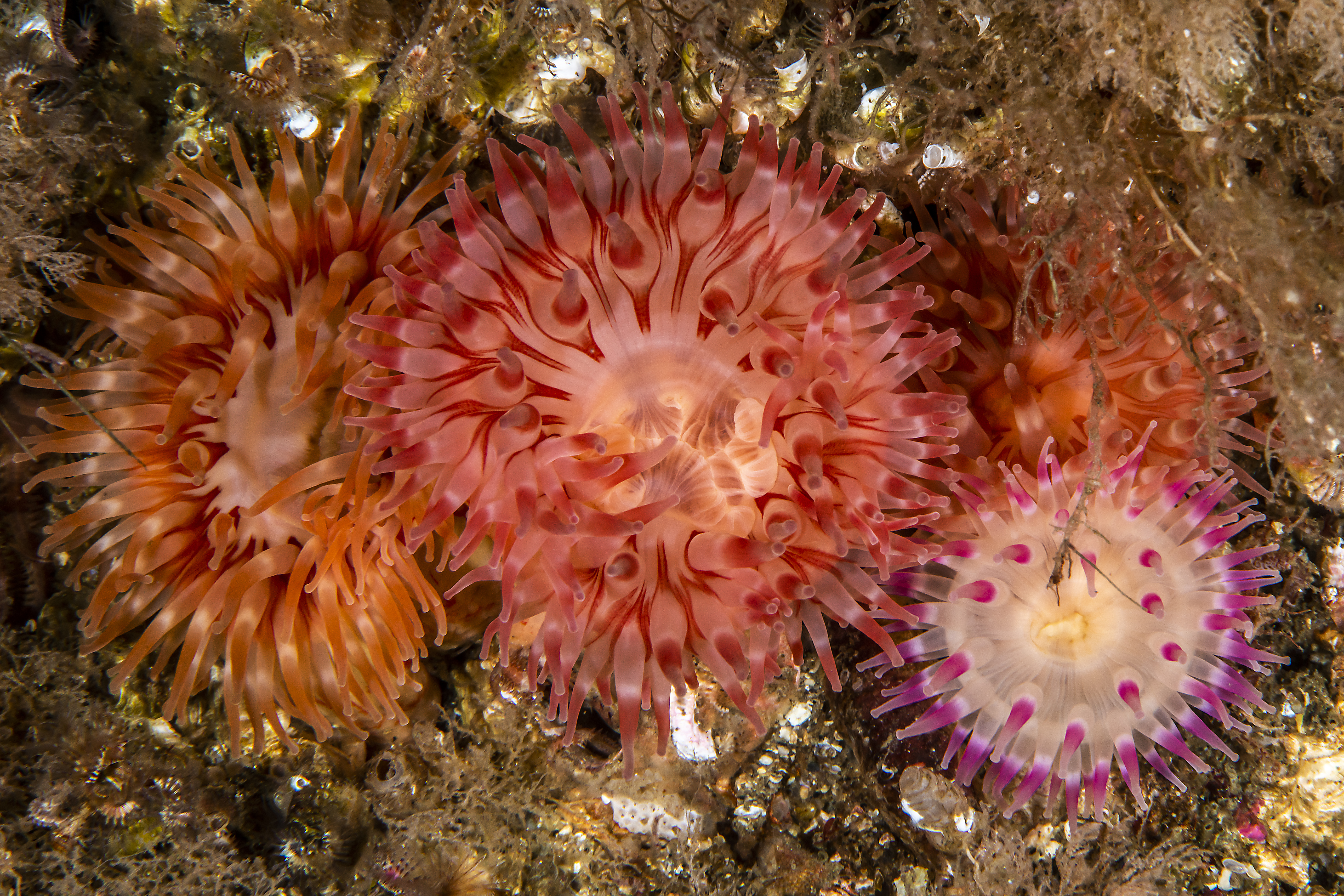 Fargevarianter av Urticina crassicornis.
