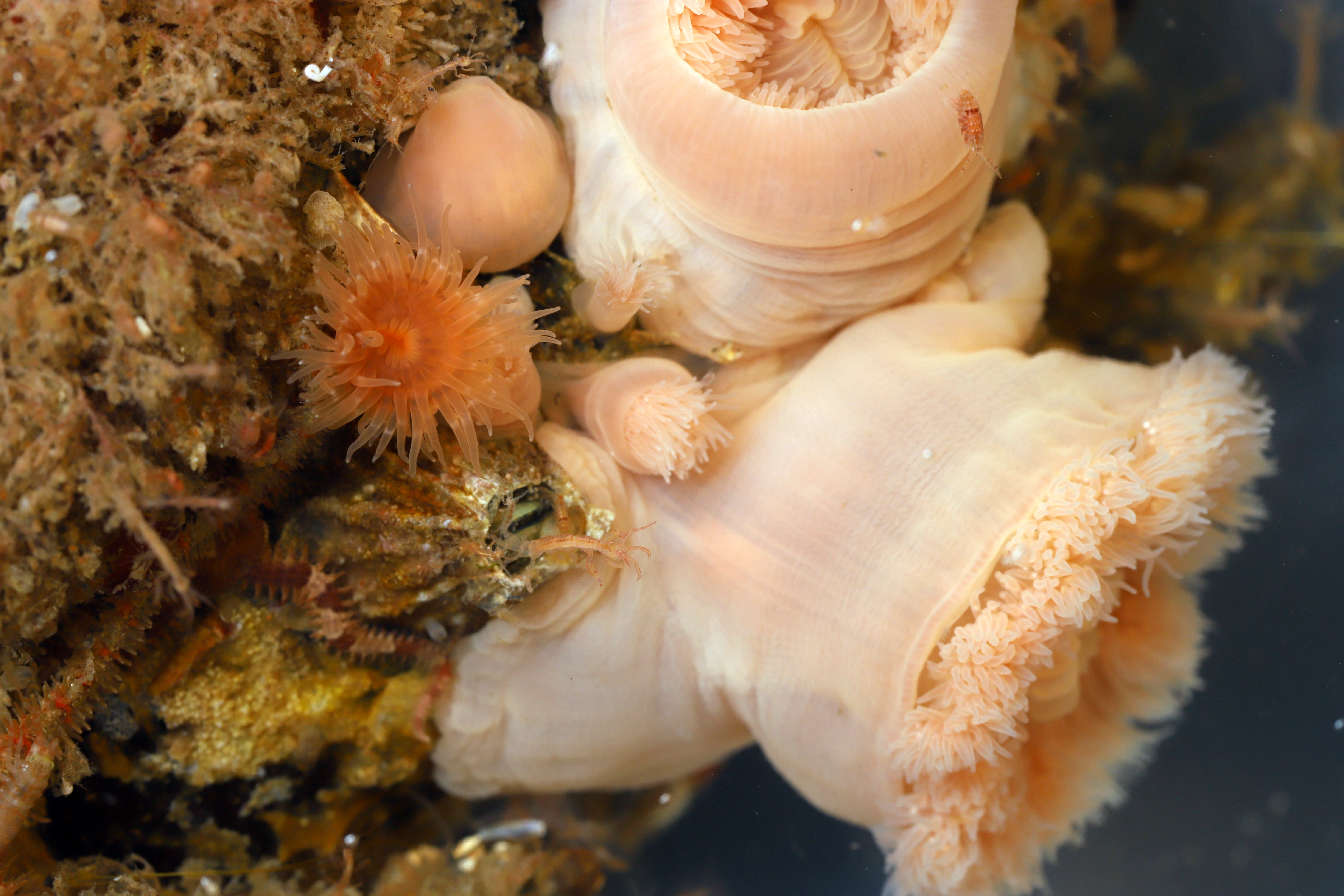 Blant fastsittende sjøanemoner, mosdyr, rur og sekkedyr i Saltstraumen finner ulike små krepsdyr,muslinger og slangestjerner seg til rette.