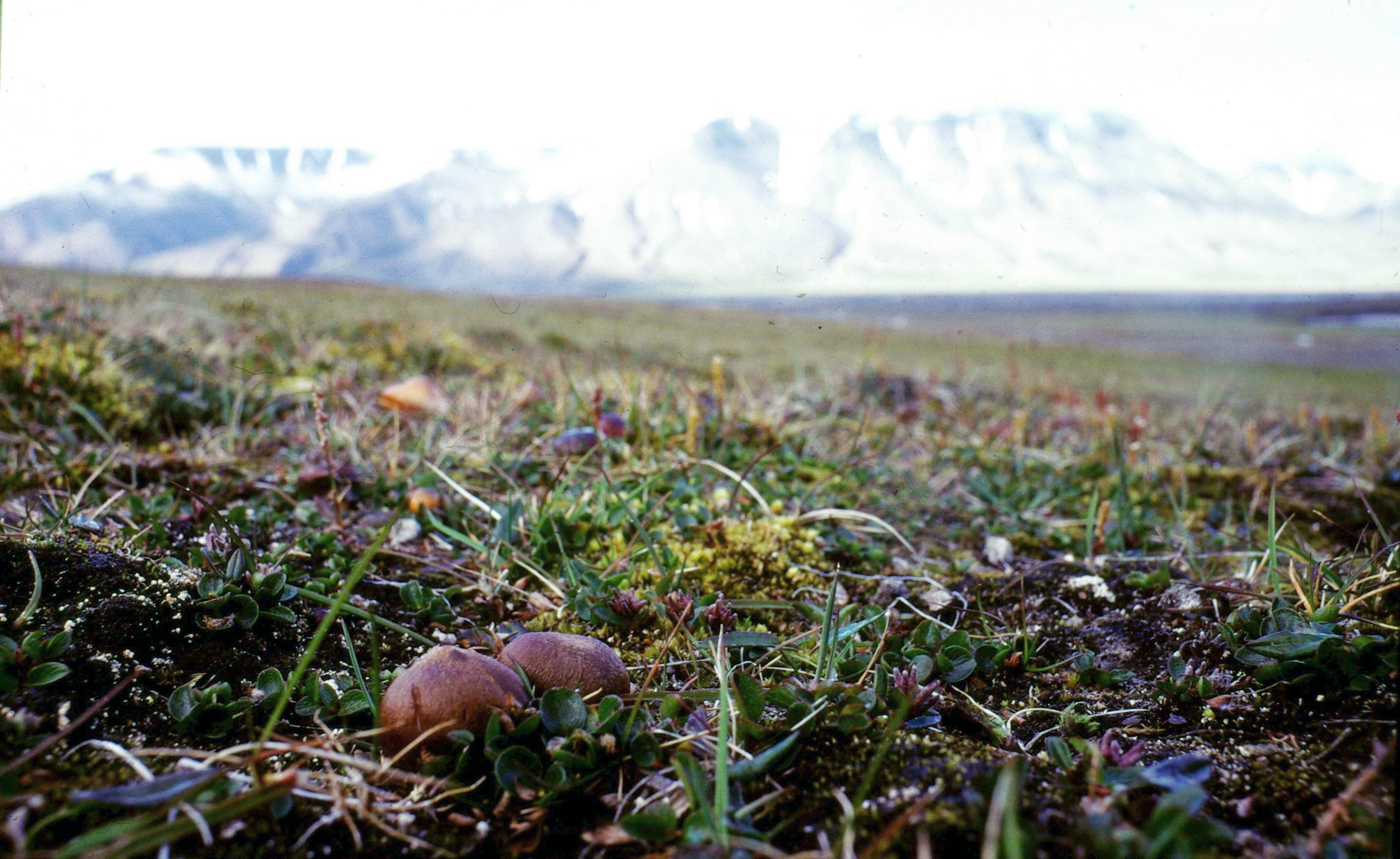 Fjellslørsopp Cortinarius alpinus er kanskje Svalbards vanligste slørsopp, og den er også vanlig i fjellstrøk på fastlandet. Den danner oftest mykorrhiza med vier, på Svalbard med polarvier Salix polaris. Bildet er fra Lonyearbyen, ikke langt fra den gamle kirkegården. Hjortfjellet i bakgrunnen.