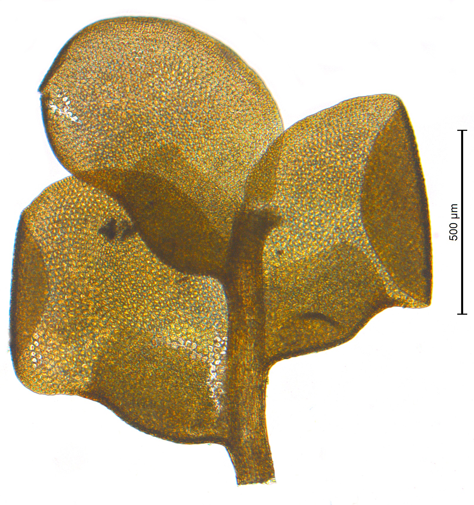 Stengel med blad, der vi ser den store dorsale fliken og den lille ventrale fliken.