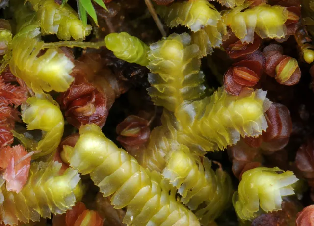 Storstylte Bazzania trilobata sammen med rødmuslingmose Mylia taylori.