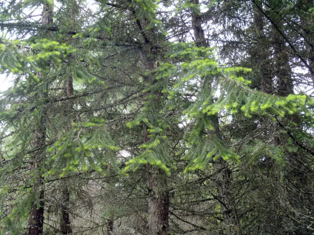 Douglasgran i tett bestand i restane etter Lippes Arboret i Bymarka i Trondheim.