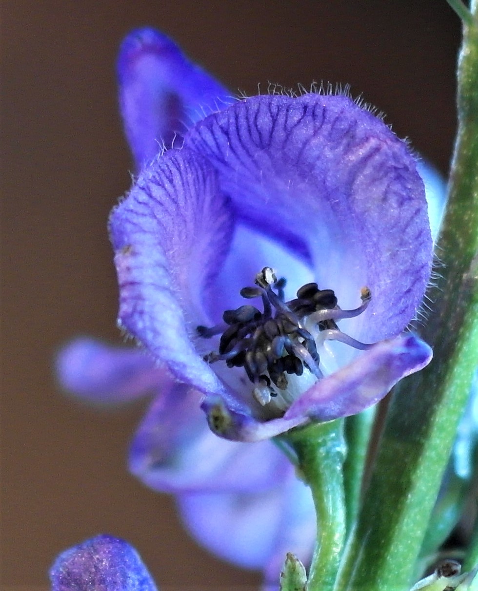 Blomane, her mørkblå, sit i ein lang klase. Hjelmen er snau, om lag like høg som brei og smalnar brått mot spissen.